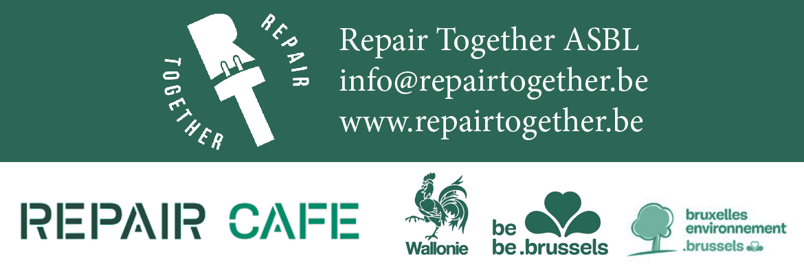 Repair Together asbl (repairtogether.be) est l’association partenaire de la Fondation Repair Café en Belgique. Elle a été créée en Belgique en mai 2013 par des responsables de Repair Cafés bruxellois. Aujourd’hui, Repair Together rassemble toujours des personnes actives dans le réseau des Repair Cafés francophones de Belgique, Bruxelles & Wallonie. Deux personnes se chargent des projets et de la coordination et une personne en renfort à l’administration, tous à temps partiel cumulé à du bénévolat. L’asbl est officiellement reconnue par les institutions gouvernementales de la région bruxelloise et de la région wallonne. Elle entretient par ailleurs des contacts réguliers avec la Fondation Repair Café Internationale et d’autres réseaux plus récents, comme en France. Repair Together collabore et côtoie également toutes les nouvelles initiatives citoyennes comme les Villes en Transitions, la communauté des Makers Faire, les Fab Labs, mais aussi les milieux académiques et les institutions européennes.